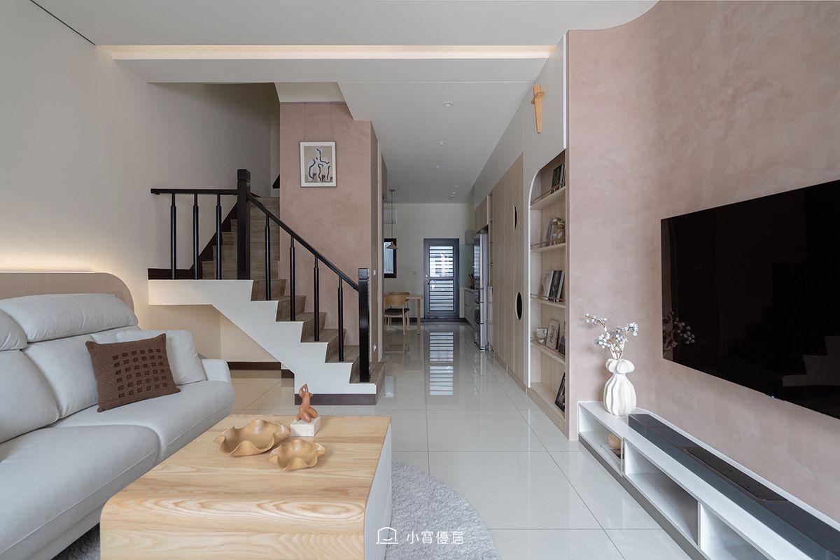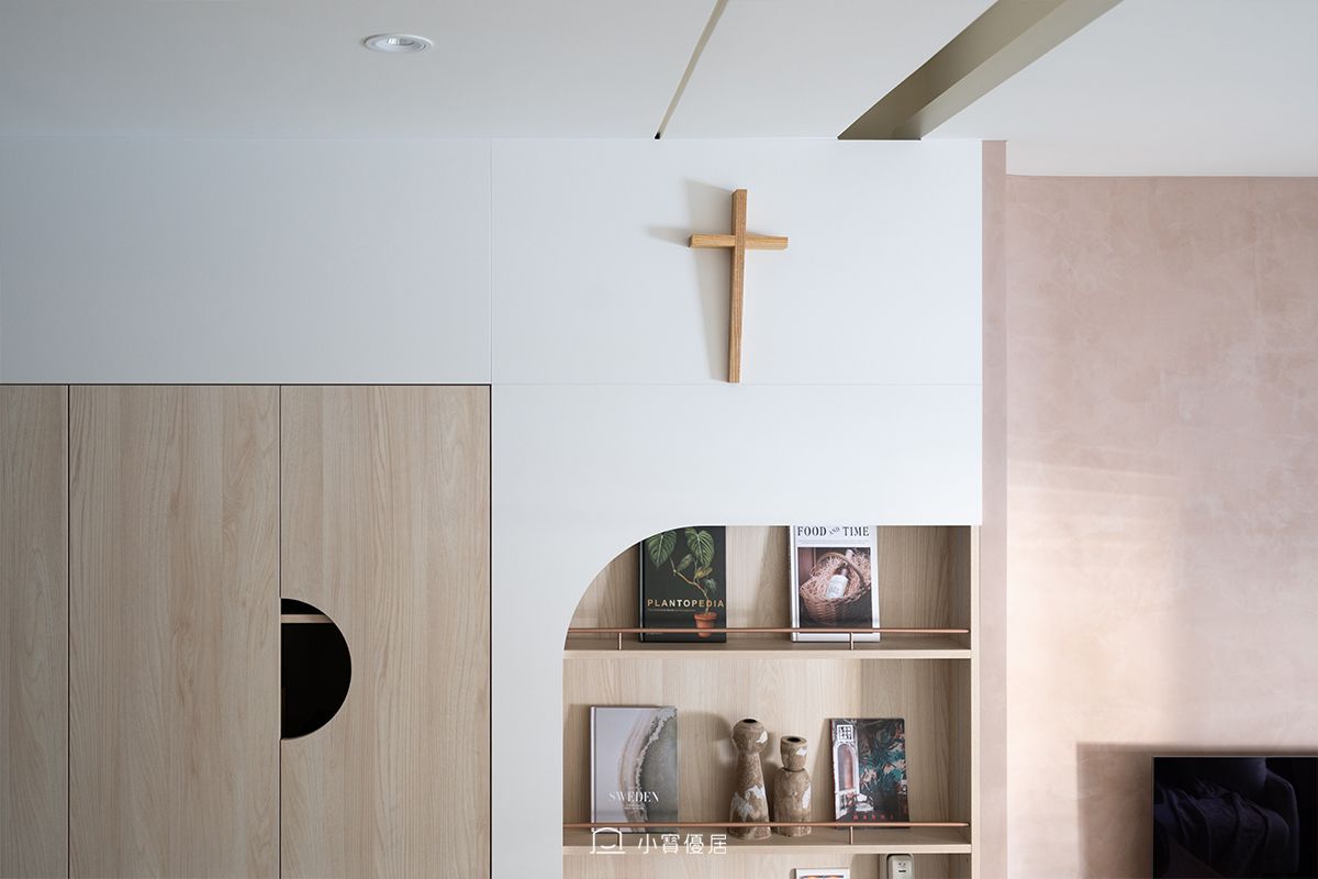 客廳是家的核心,也是信仰的縮影。我們選用帶有手感溫度的粉色司曼特漆(色號 SVL-416)作為主調,搭配柔和的圓弧造型與象徵信仰的十字架,構建出平靜沉穩的視覺焦點。