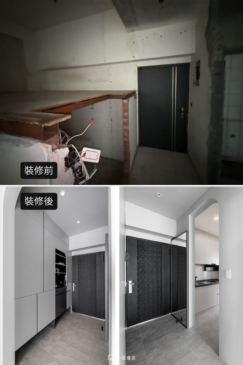 - 雙面共櫃:玄關與次臥利用「雙面共櫃」設計,下方是玄關鞋櫃,上方則是次臥床邊的收納,將隔間牆的功能發揮到極致。